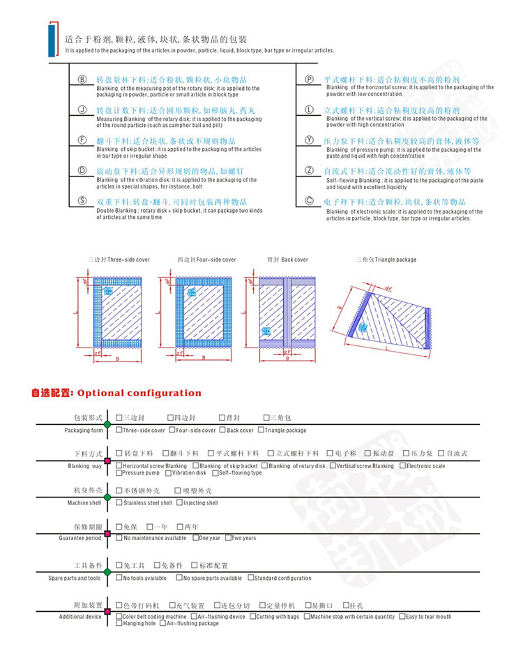 - 适应对象:粉剂,颗粒,块状,条状,不规则物品,如:膨化食品,糖果,谷物,豆类,奶粉,调味品,麦片,茶叶,小玩具,螺丝,樟脑丸,干燥剂.多种包装的形式,多种下料方式自由组合,适合各式各样的包装物品.自动完成制袋,充填,封口,切断,充气,打码,限量停机,定包分切等一系列动作.